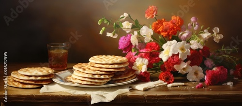 Passover Jewish flatbread displayed on a bright background with copy space image available.