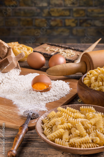 pasta, egg, preparation, yolk, still life, ingredient, flour, fusilli, wooden, heap, nobody, white, dough, wheat, utensil, rolling pin, food
