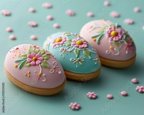Pastel Easter cookie eggs, trio on minimal turquoise backdrop, floral Easter design, closeup , 8K , high-resolution, ultra HD,up32K HD