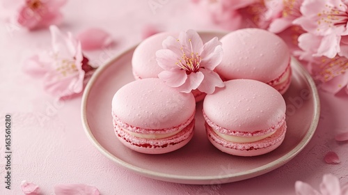 Pastel pink macarons with a hint of sakura sit next to cherry blossoms on a ceramic plate. The scene exudes springtime vibes and harmonious flavors.