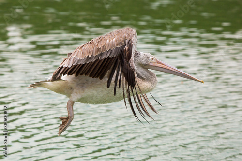 Pelican flying in zoo on pond background