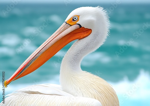 pelican, bird, wildlife, nature, ocean, water, shore, closeup, portrait, animal, beak, feathered, wing, closeup, exotic, tropical, beautiful, animal portrait, birding, photo, photo, macro, sharp, detail, colours, white, orange, bright, marin, coastal, sea, wave, oceanic, fauna, birdlife, animal, portraiture, photographic, bird