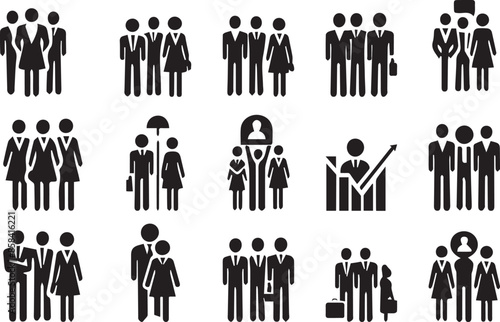 People Icons: A diverse set of black silhouette icons depicts the professional and social worlds. From business leadership to team management and casual interactions, these versatile icons capture the