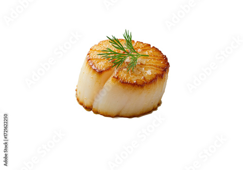Perfectly seared plump sea scallop, golden-brown crust, fresh dill, sea salt on minimalist white plate, isolated on transparent. Studio lighting, gourmet culinary perfection