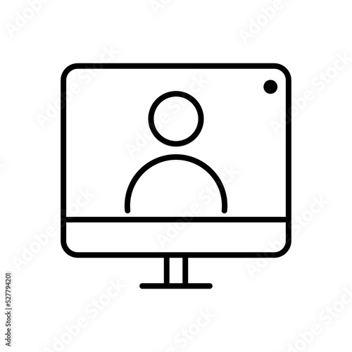 Person at the monitor. Speech bubble, video lesson, commentary, explanation, laptop, online learning, distance learning. Vector line icon for Business and Advertising