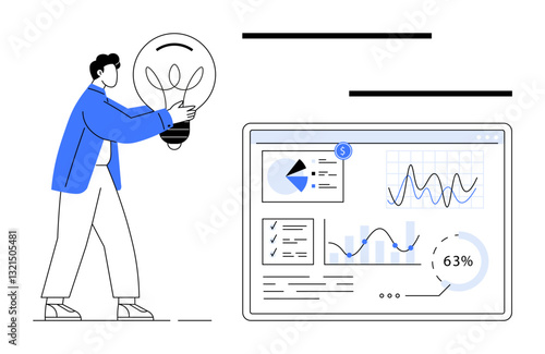 Person holding lightbulb alongside data dashboard featuring charts, graphs, and visual statistics. Ideal for innovation, analytics, creativity, data insights, teamwork productivity technology. Flat