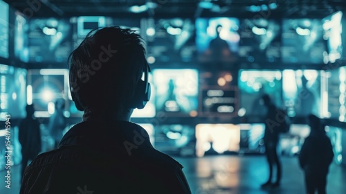 person, earphones, display, technology, image, silhouette, light, colourful, wall, indoor, night, modern, entertainment, viewer, watching, digital, screen, display, exhibition, contemporary, visual, media, optical, image, event, large, background, colours, light, people, illuminated, isolated, copy space, business, woman, computer, couple, businessman, communication, city