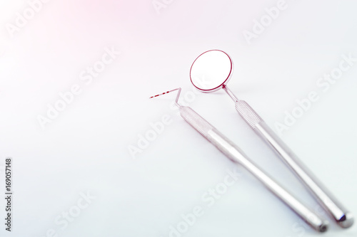 Photo dental instruments mirror, probe, tweezers, mask, binocular glasses magnifier, model of human jaw placed on white background