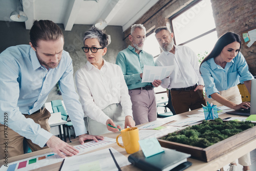 Photo of coworking project teamwork people paperwork graph work together conference meeting successful nice light office