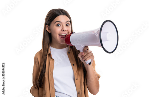 photo of surprised tween girl announcer hold loudspeaker. teen girl announcer