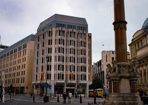 city, street, building, downtown, tower, sky, road, urban, metropolis, bus, city landscape, old, pedestrian, town square, architecture, business building, travel, cloud, window, tall, outdoors, large, daylight, neighbourhood, front, person, facades, people, square, tower block, neighbourhood, highrise, landmark, pillar, london