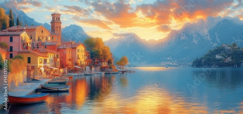 Picturesque Lakeside Village at Sunset