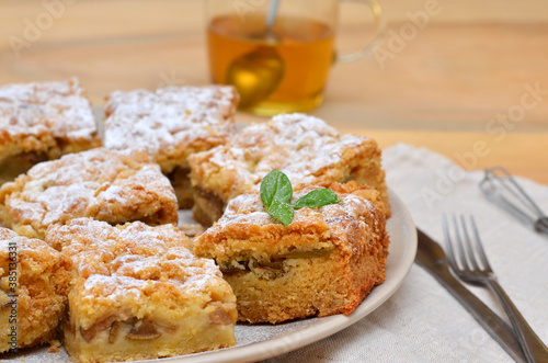 cake, cake, food, pie, homemade, apple pie, cooking, powdered sugar, sliced, icing sugar, dessert, white, sugar, cup, tea, natural, cookery, breakfast, sweet, meal, piece, snack, pastry, delicious, eat, bakery, epicure, cooked, pastry, delicacy, kitchen, bake, seasonal, tradition, home, crust, tasty, wooden, background, traditional, fresh, rustic, healthy, organic, plate, cutlery, closeup