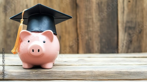 Piggy Bank with Graduation Cap on Weathered Wood, Representing Financial Goals and Academic Aspirations, Soft Light Enhancing the Vintage Aesthetic