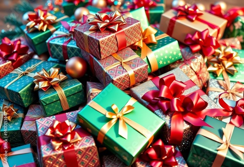 Pile of lavishly wrapped gifts, shimmering ornaments, festive ribbons, texture, commercial