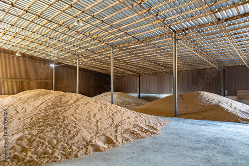 Piles of wheat grains at mill storage or grain elevator. The main commodity group in the food markets.