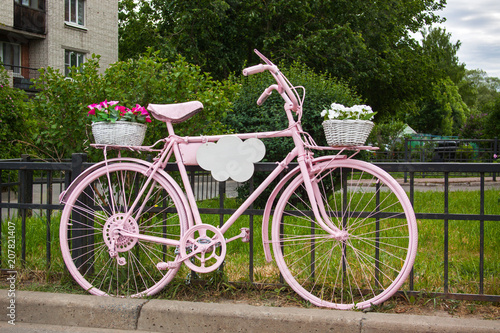 Pink bicycle with flowers baskets long standing next to the fence