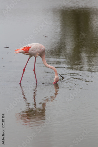 Pink flamingo fishing on a muddy lake in La Camargue, France