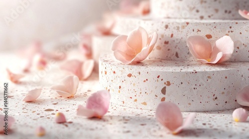 rose, flower petals, pink, terrazzo, white, texture, background, floral, design, minimal, modern, abstract, elegant, romantic, soft, pastel, decorative, display, product, photo, still, life, composition, marble, stone, circle, round, shape, layer, subtile, delicate, beauty, aesthetic, clean, simple, dais, platform, stage, showcase, presentation, styling, wedding, event, spring, summer, light, bright, arrangement