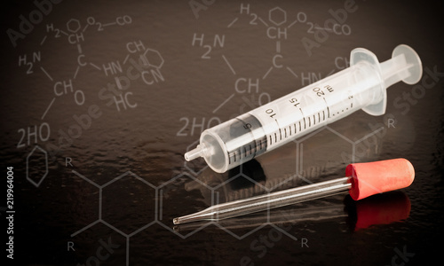 Pipette and Syringe science laboratory equipment on black table.