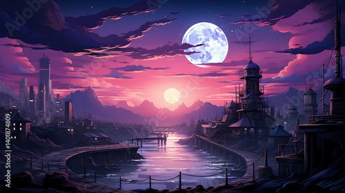 pixel, art, city landscape, night, moon, landscape, city, water, river, purple, pink, sunset, sky, urban, scene, building, dusk, evening, town, scenery, architecture, light, horizon, bridge, travel, nature, cloud, vintage, retro, pixelated, gaming, background, fantasy, colourful, bright, calm, peaceful, atmospheric, artistic