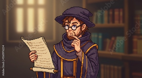 Pixel art wizard studies an ancient scroll within a library, contemplating magic and secrets found in old texts.