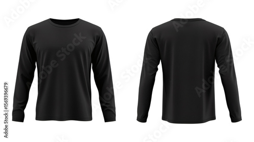 Plain black long sleeve round neck shirt 3D mockup, featuring front and back views for showcasing your apparel designs on white background