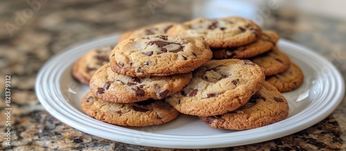 Plate of chocolate chip cookies on granite counter
