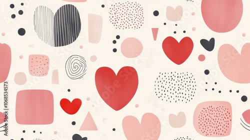 Playful Abstract Valentine's Day Pattern with Hearts and Shapes, Fun and modern Valentine's Day pattern featuring hearts, dots, and geometric shapes in red, pink, and black tones.