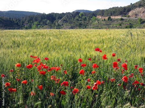 Poppies,Cereal plantation, Gudar mountains,Teruel, Aragon,Spain