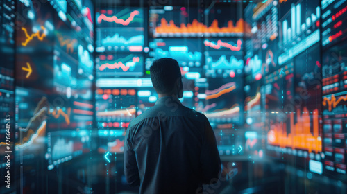 Portfolio manager overseeing financial investment accounts, following stock market global exchange trends. surrounded by digital screens displaying statistics and graphs, generative ai