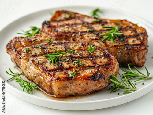 background, blank, board, cooking, diet, food, fork, grill, grilled, juicy, knife, large, lean, meat, nourishment, pepper, plate, pork meat, protein, red, eatery, rosemary, rustic, steak, stripes, thyme, white, wooden