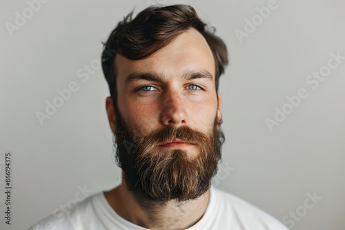 man, male, portrait, face, beard, blue eye, caucasian, white shirt, serious, looking, person, model, human, expression, confident, photogenic, attractive, adult, closeup, studio, background, simple, studio shot, young, facial hair, grooming, men's fashion