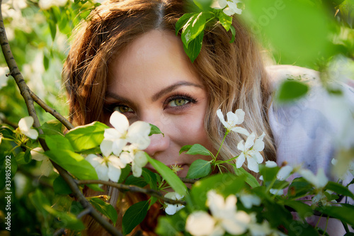 Portrait of a beautiful blonde girl with green eyes and blossoming apple tree with white flower in the park in a spring time