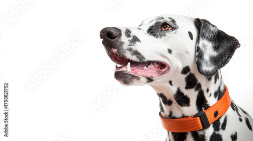 Portrait of a beautiful Dalmatian dog with an orange collar looking up