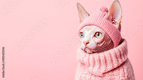 cat, sweater, pet, mammal, clothing, fashion, love, winter, home, autumn, animal, animal, face, portrait, cute, funny, pet, young, beautiful, canino, purebred, domestic, breed, bald, sphynx, adorable, cold, hairless, warm, wearing, pink, copy space, hat