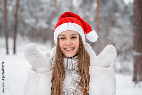 Portrait of a beautiful young woman in a winter red hat smiling and playing with snow, picturesque winter forest