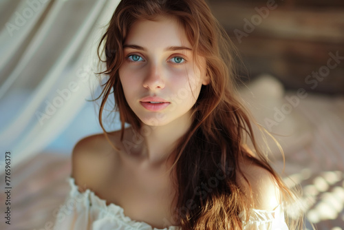 Portrait of a beautiful young woman with long brown hair and blue eyes in a white dress, looking at the camera against the background of a bed on which there is a light linen curtain