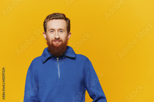 Portrait of a man smiling in a blue sweater on a yellow background copy space, space for text