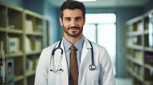 Portrait of a smiling man doctor with a stethoscope in a medical hospital with modern equipment.