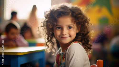 Portrait of a toddler girl sitting at a desk at kindergarten. Preschool and eduction