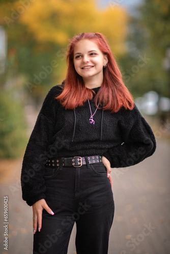 Portrait of a young beautiful red-haired girl in black jeans and a black sweater in an autumn park.