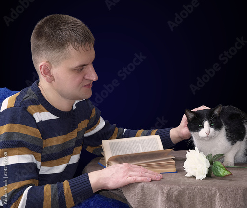 Portrait of a young manly serious man with a short haircut on a black background sitting next to the table, on the table a cat, a book, a rose flower