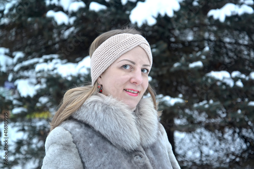 person, 1, young, age, 30, 35, 30, year, portrait, slavic, russian, appearance, beautiful, nice, cost, directly, smile, natural, fur, knitted, woolen, head, knit up, needlecraft, beige, grey, colours, warm, winter, clothes, snow