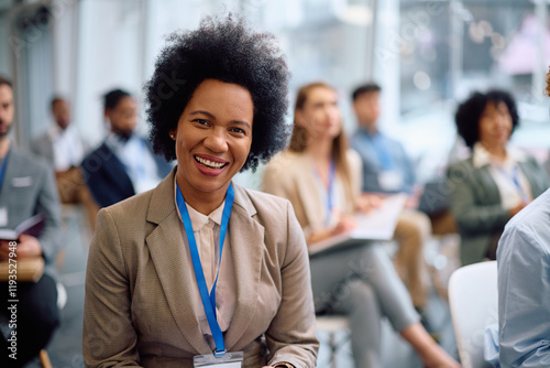 Portrait of happy black businesswoman on seminar at convention center looking at camera.
