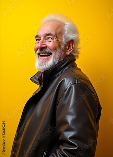 portrait, old age, caucasian, man, smiling, confidently, brown, leather, jacket, joyful, isolated, yellow, background, cheerful, happy, positive, confident, radiant, friendly, vibrant, pleased, engaging, expressive, warm, casual attire, relaxed, attractive, lively, upbeat, beaming, content, mature, stylish, amiable, distinguished, graceful