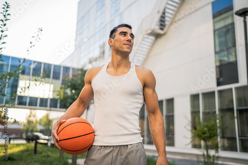 man, basketball, ball, portrait, caucasian, male, young, athlete, strong, muscular, standing, sport, urban, recreation, adult, person, 1, day, activity, activewear, sportsman, training, athletic, playing, active, fitness, sport, looking, player, sporty, exercise, lifestyle, sportive, basket, healthy, outdoors, physical exercise, holding, front view, enjoy, happiness, happy, white, tank top, copy space