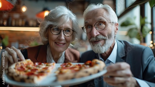Portrait of two senior businesspeople elderly business woman and man having a meeting or a break eating pizza in the office : Generative AI