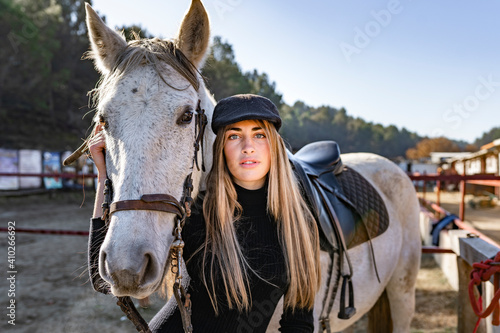 happiness, 1, people, sport, animal, adult, woman, outdoors, day, one animal, horse, horseriding, recreation, leisure, ranch, farm, agriculture, rancher, hobby, standing, love, positive, emotion, spain, sunlight, white horse, rider, young, young adult, adult, alone, female, blond, happy, care, joy, caucasian, long hair, hair, harness, saddle, paddock, pasture