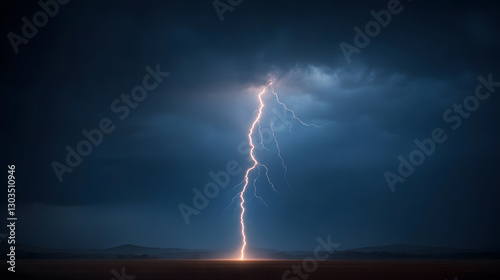 Powerful lightning strikes the ground during a storm, illuminating the night sky with a brilliant flash and illuminating the landscape below.